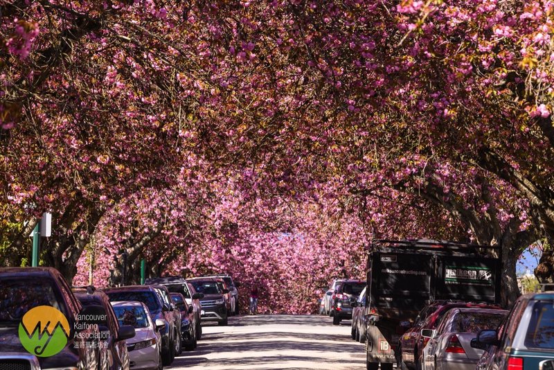 串連 Dumfries Street 夾 28 至 32nd Ave 三條街在路旁的關山櫻,整條街都被一簇簇的櫻花覆蓋著,如同一條櫻花隧道般,非常誇張。最有趣是,如果你由33rd Avenue 行入去,在迴旋處那裡向北望,你會覺得整條前路都被櫻花包圍住,因為去到約30th Avenue 條路會走向下坡,所以你就見到再前面的樹頂的櫻花。沒有車的街坊只需坐33 號巴士到 Knight 街 Kensington Park 下車行幾步就到。